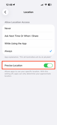 HUOMIO: Tarkan sijainnin kytkeminen päälle varmistaa, että GPS-sijaintitiedot ovat mahdollisimman tarkkoja. Jos tämä ei ole käytössä, GPS arvioi sijainnin noin ~3²km alueella.