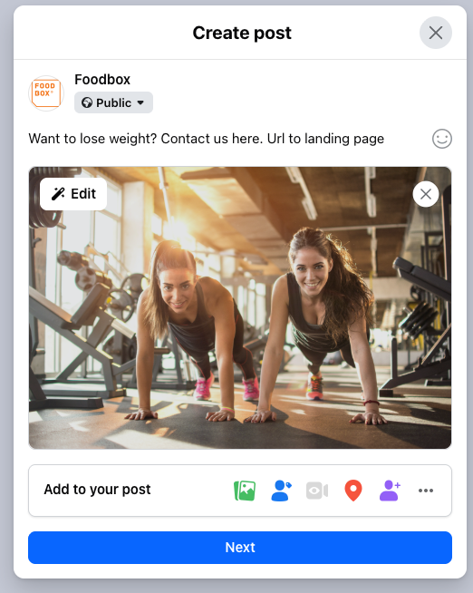 Here you can publish a campaign text and an image on your local Facebook page that links to a landing page. If you use Wondr’s templates, suggested campaign text is included under each campaign.